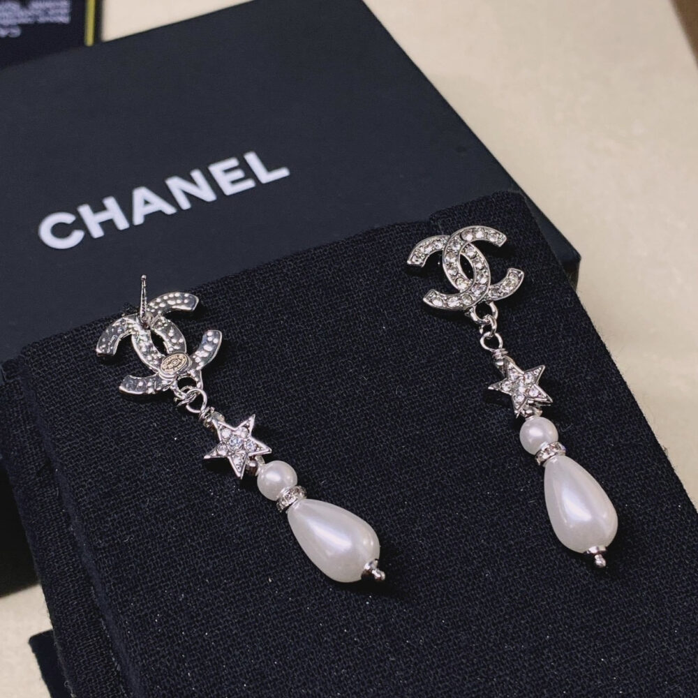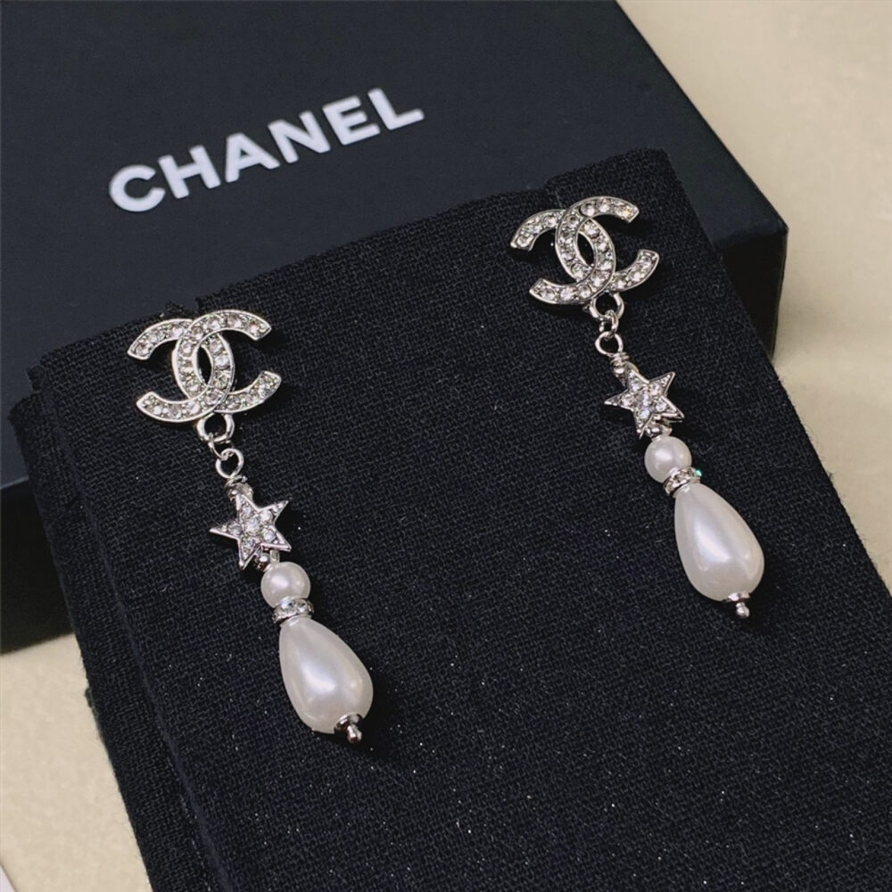 These are Chanel dangle earrings featuring the iconic interlocking CC logo inlaid with sparkling crystals. The design includes a small star charm and a drop-shaped faux pearl, giving the earrings a chic and elegant touch. Perfect for adding sophistication to both casual and formal outfits.