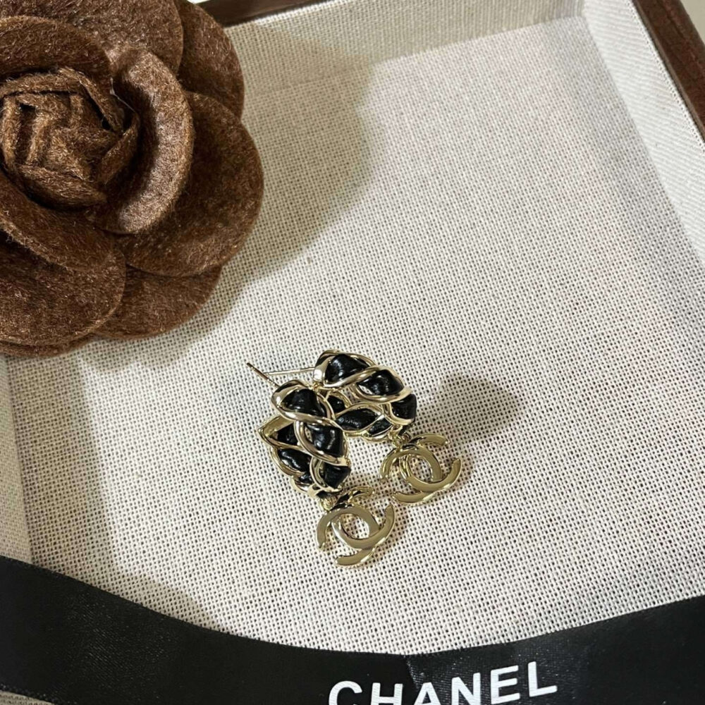 The hoops are designed with a gold and black intertwined chain, creating a bold yet elegant look. Hanging from each hoop is the signature interlocking CC charm in gold, adding a timeless Chanel touch.