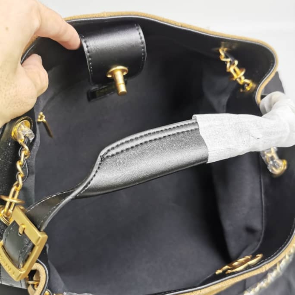 A luxurious beige and black shopping bag with gold-tone metal accents. Spacious and stylish, this bag is perfect for daily use or as a statement accessory.