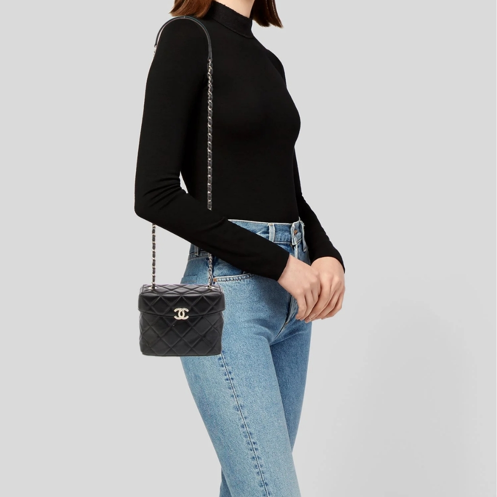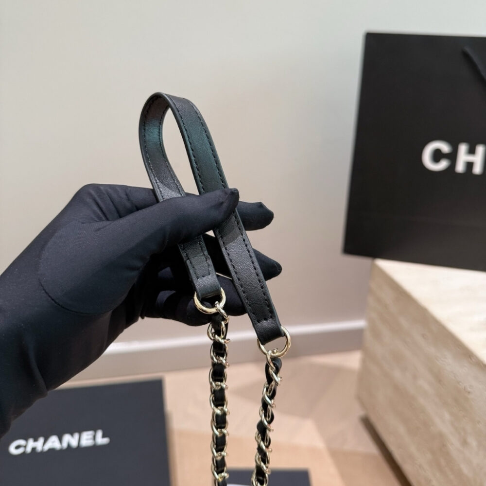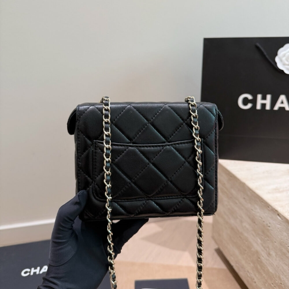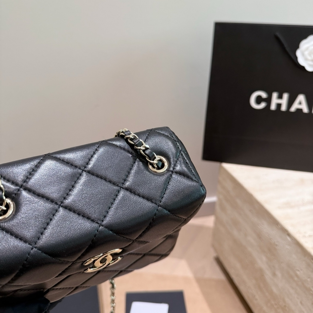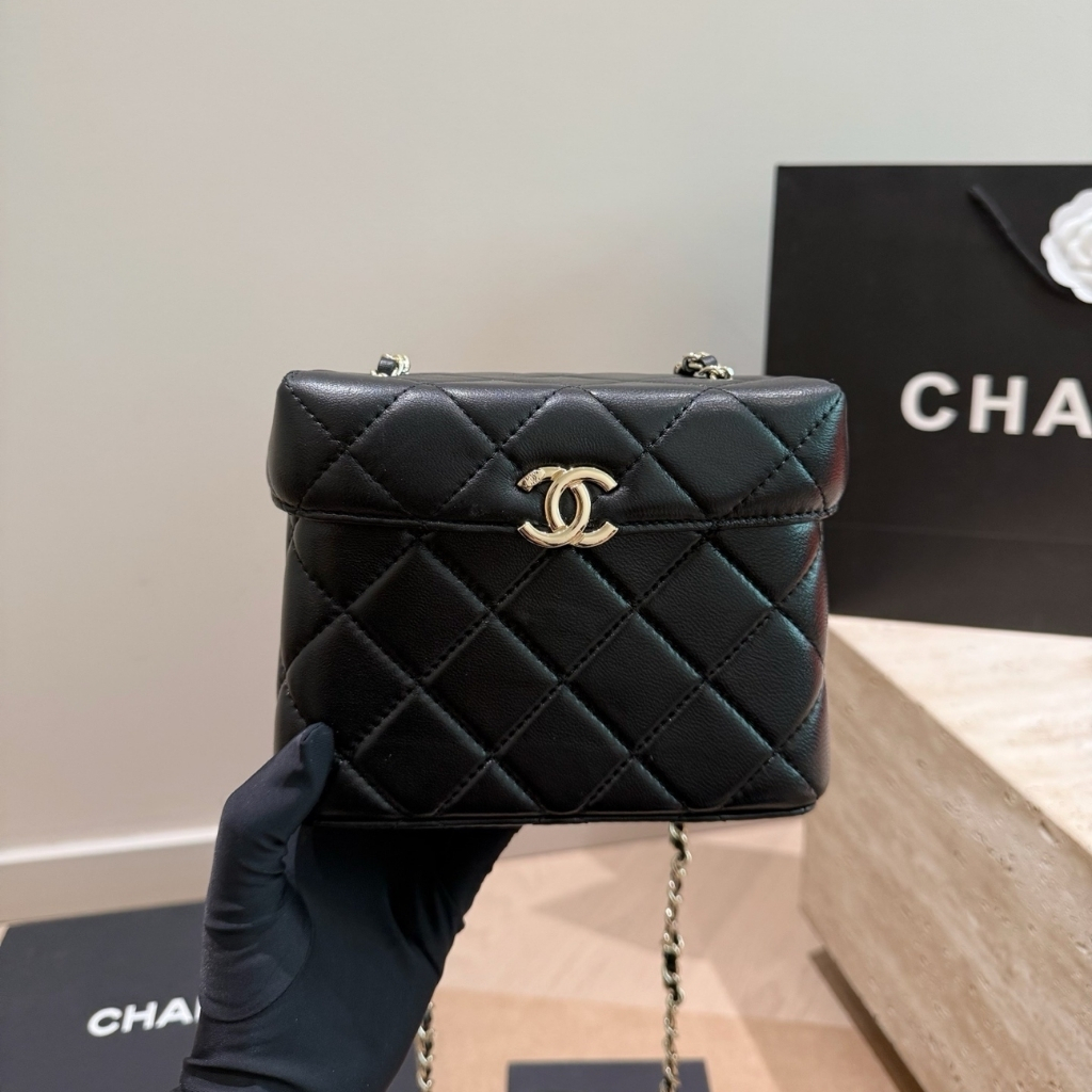 The features the signature diamond quilting and the iconic CC logo on the front, paired with a structured box silhouette for a refined look. The bag includes a leather-threaded chain strap for shoulder or crossbody wear. With its compact 16cm size, this elegant piece is perfect for evenings, special events, or adding a sophisticated touch to any outfit.