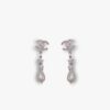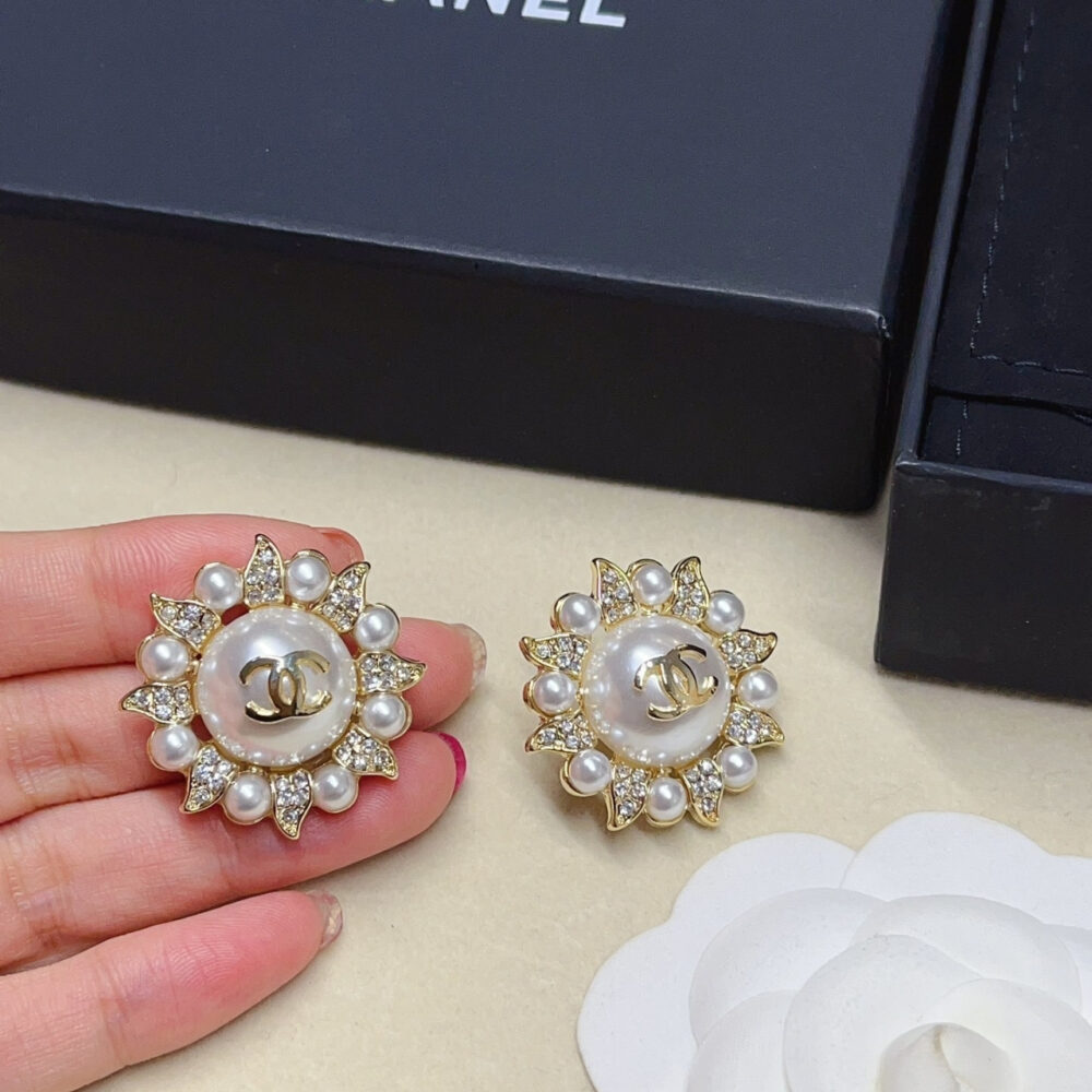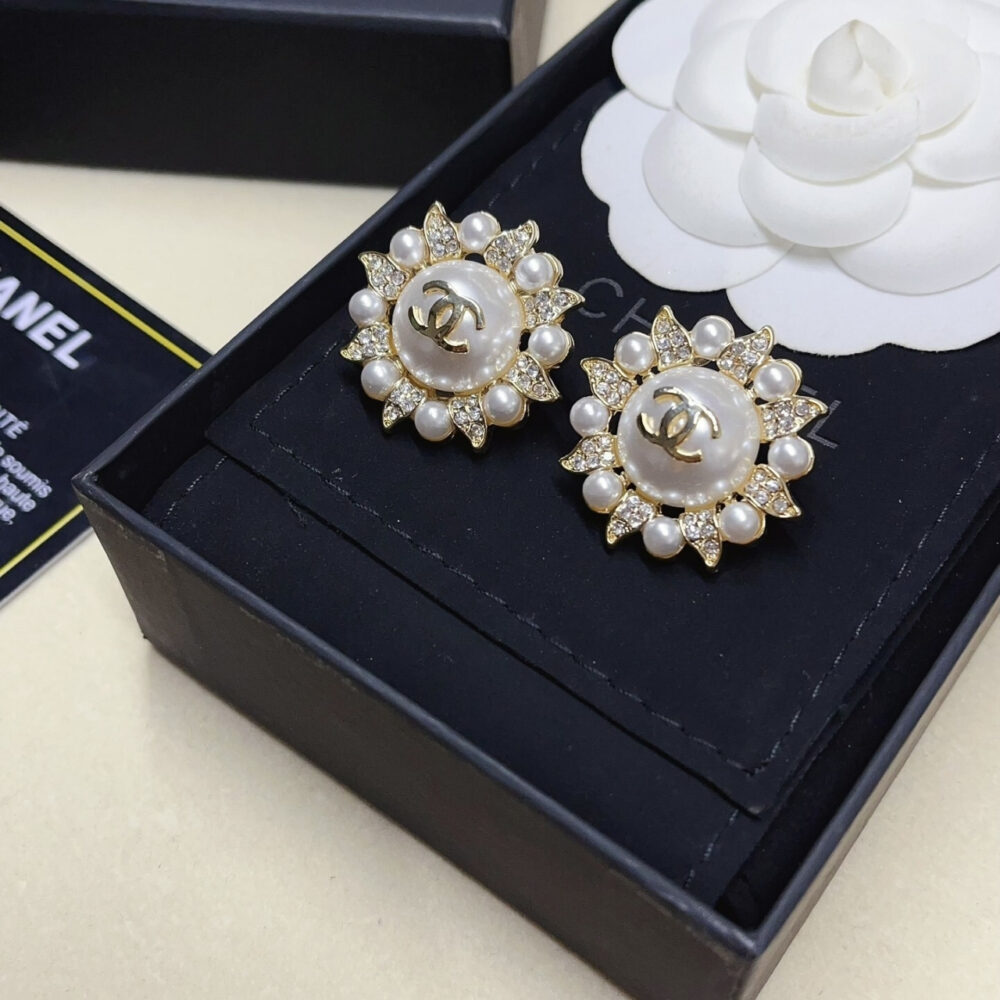 These are Chanel stud earrings designed with a floral-inspired motif. The center features a large pearl adorned with the iconic gold CC logo, surrounded by alternating small pearls and crystal-studded petal details.