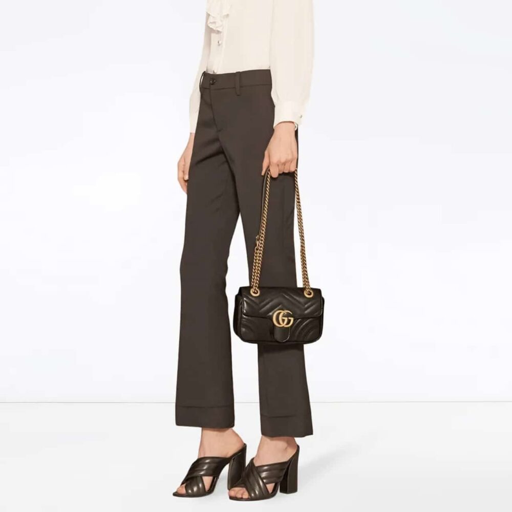 The Gucci GG Marmont Mini Shoulder Bag Black is a compact yet elegant accessory. It is crafted from matelassé in Black, featuring the signature chevron pattern. The bag is finished with the iconic Double G antique gold-toned hardware and a sliding chain strap for versatile styling.