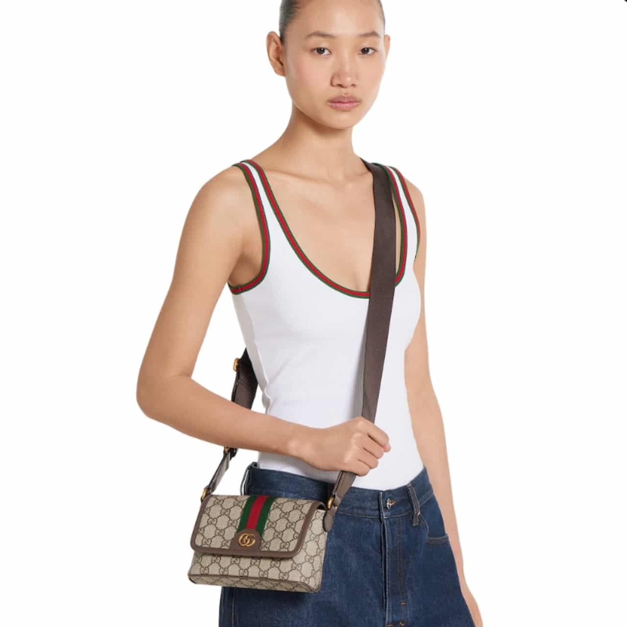 The Ophidia collection evokes the House’s heritage with the signature Web stripe and Double G emblem in light gold-toned finish. This mini bag is presented in GG Monogram coated fabric.