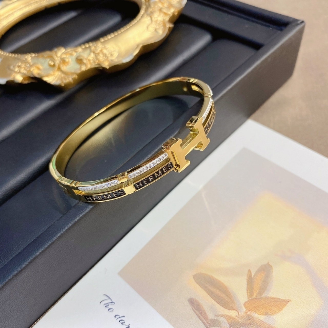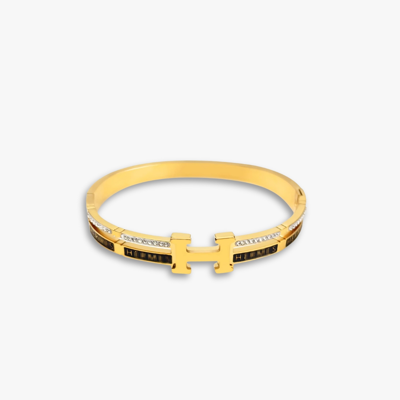 This is an Hermès bracelet in a polished gold-tone finish. The design features the iconic “H” clasp detail at the center, along with engraved HERMÈS branding around the band. It is accented with small crystals, adding a touch of elegance and luxury sparkle