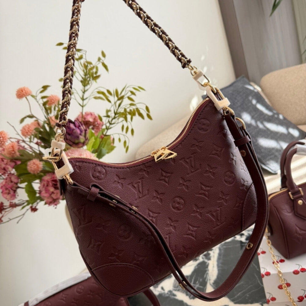 The classic Boulogne PM is reimagined for the season in a red colorway that complements the sophisticated gold-toned hardware. Inspired by archival Louis Vuitton designs, this edition is crafted from Monogram Empreinte embellished with a braided chain that can be removed if desired. It can be styled cross-body, over the shoulder or carried by hand.