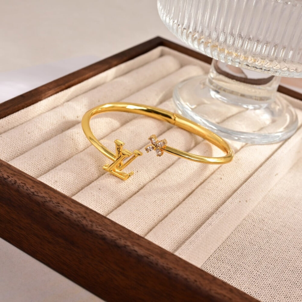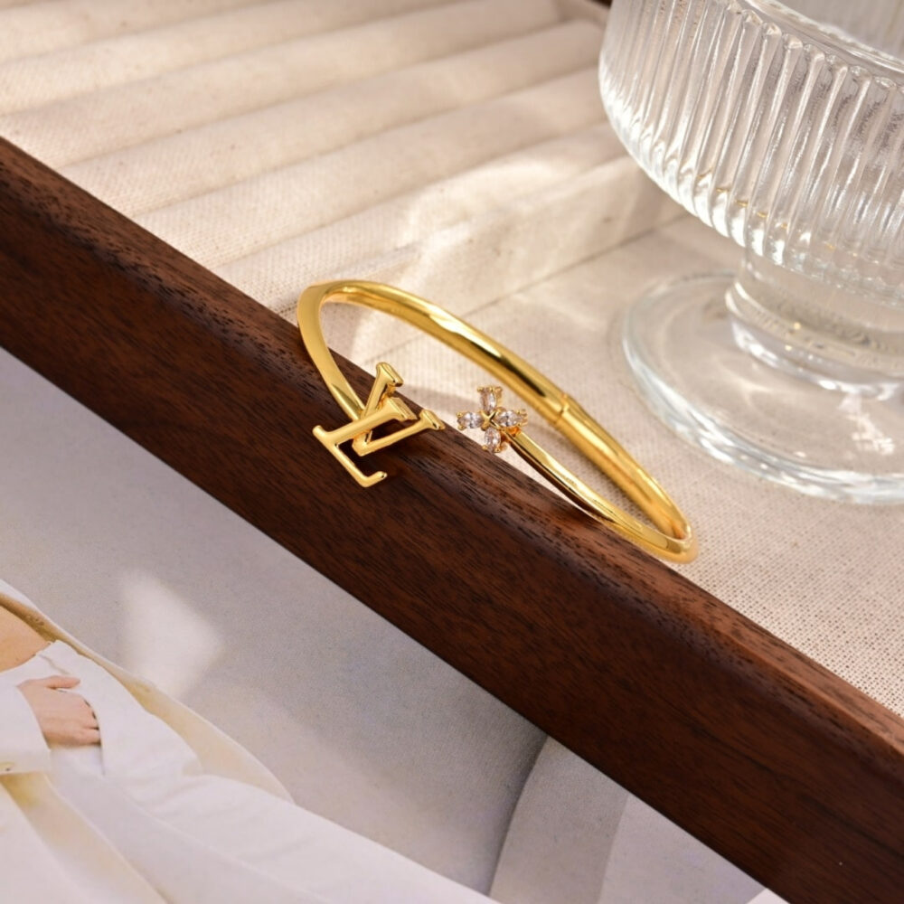 This elegant Louis Vuitton bracelet features a minimalist open design in gold tone, highlighted by the iconic LV initials on one end and a delicate Monogram Flower motif adorned with sparkling stones on the other. Its refined, modern silhouette makes it a versatile accessory that adds a sophisticated touch to both casual and formal looks.