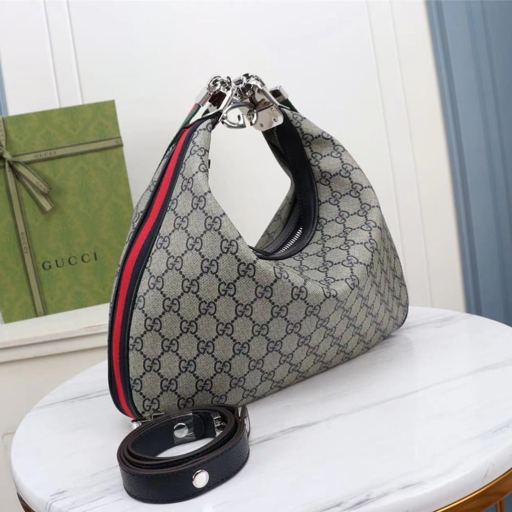 The Gucci GG Attache Large Shoulder Bag 35cm in Beige and Blue blends vintage elegance with modern versatility. Crafted from GG Supreme canvas, it features a distinctive Web stripe, gold-tone hardware, and an adjustable strap for effortless styling.