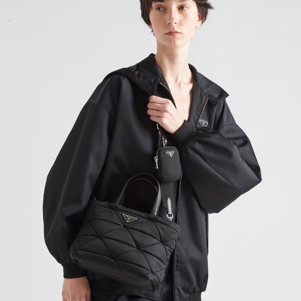 Prada’s iconic triangle logo is reinterpreted in a patchwork motif that characterizes this tote bag with soft lines made of Re-Nylon, a regenerated yarn that is the sustainable evolution of an industrial fabric made iconic by Prada in the ’80s. Complete with a mini pouch that attaches to the shoulder strap for a contemporary touch, the accessory is decorated with the iconic enameled metal triangle logo on the front.