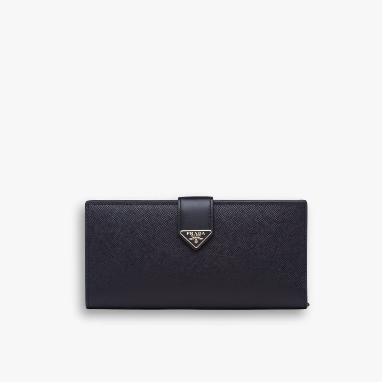 The sleek design features a snap tab closure adorned with the iconic metal triangle logo, adding a luxurious touch.