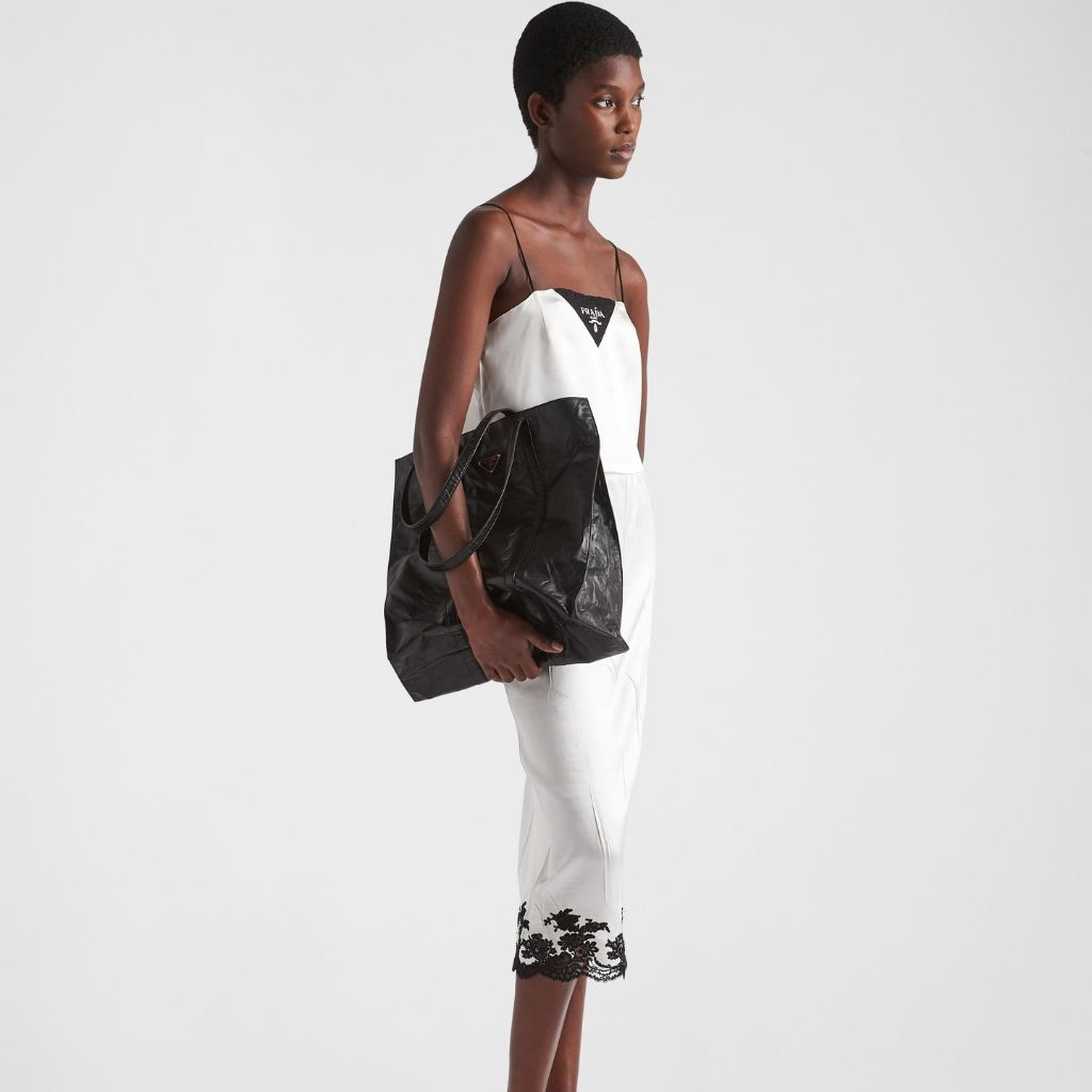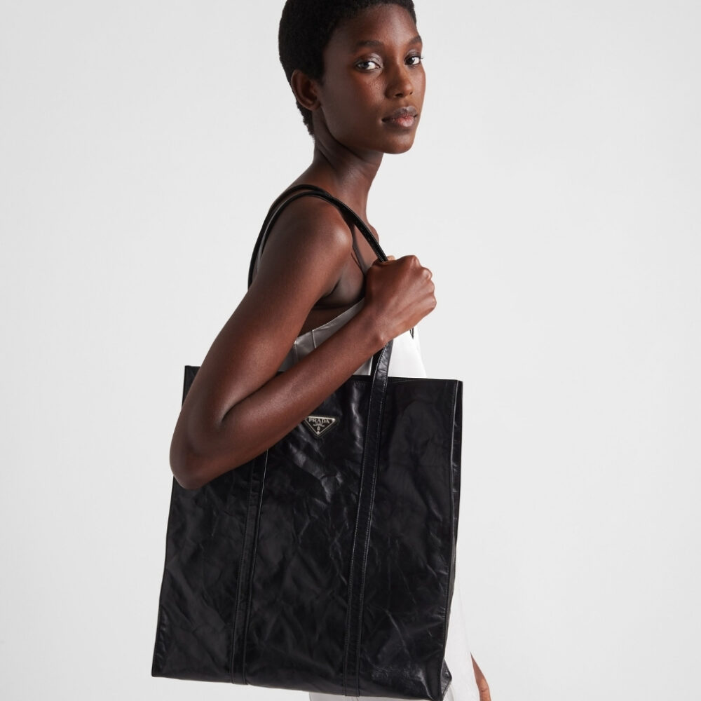 The Prada Antique Nappa Leather Tote in Black (33 cm) exudes a relaxed yet sophisticated charm, crafted from glossy nappa leather with a natural finish. The unique handmade wrinkled effect beautifully contrasts with its structured design, transforming an everyday object into a stylish statement piece. It features the iconic enameled metal triangle logo, adding a touch of elegance to its versatile allure.