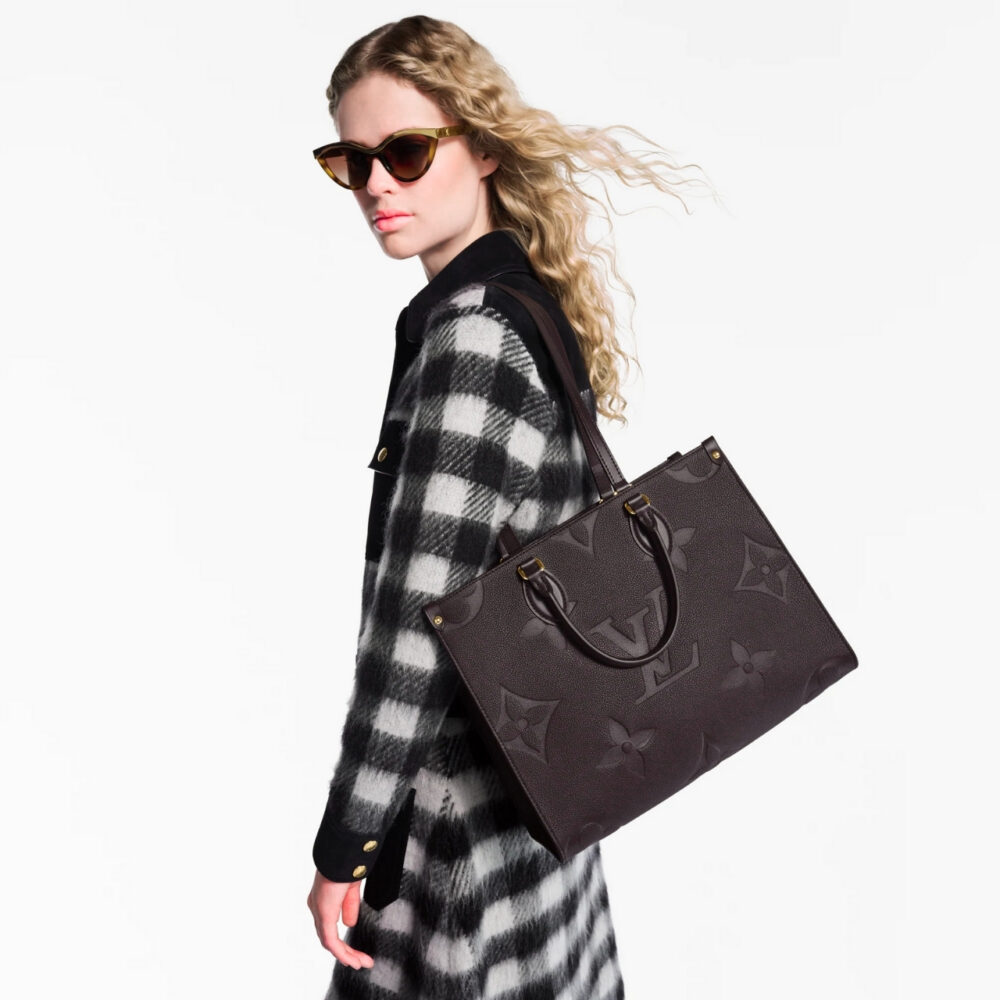 The OnTheGo MM handbag is reimagined for the season in a rich chocolate shade, accented with gold-toned hardware. It is fitted with multiple interior pockets and is sized to store a Zippy wallet, plus a laptop. Use the longer handles for shoulder carry.