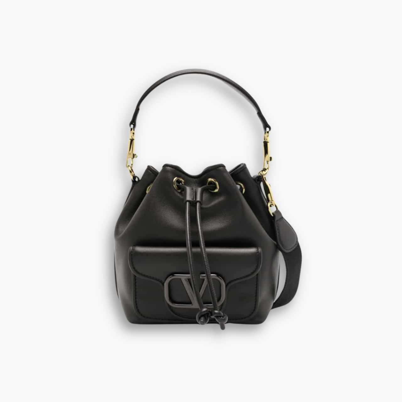 The Valentino Garavani VLogo Loco Bucket Bag in black features a detachable top handle and shoulder strap for versatile wear. Its design includes a tightening link, a front pocket with a flap, and the iconic VLogo Signature detail. The silver accents and main compartment complete this elegant yet functional piece.